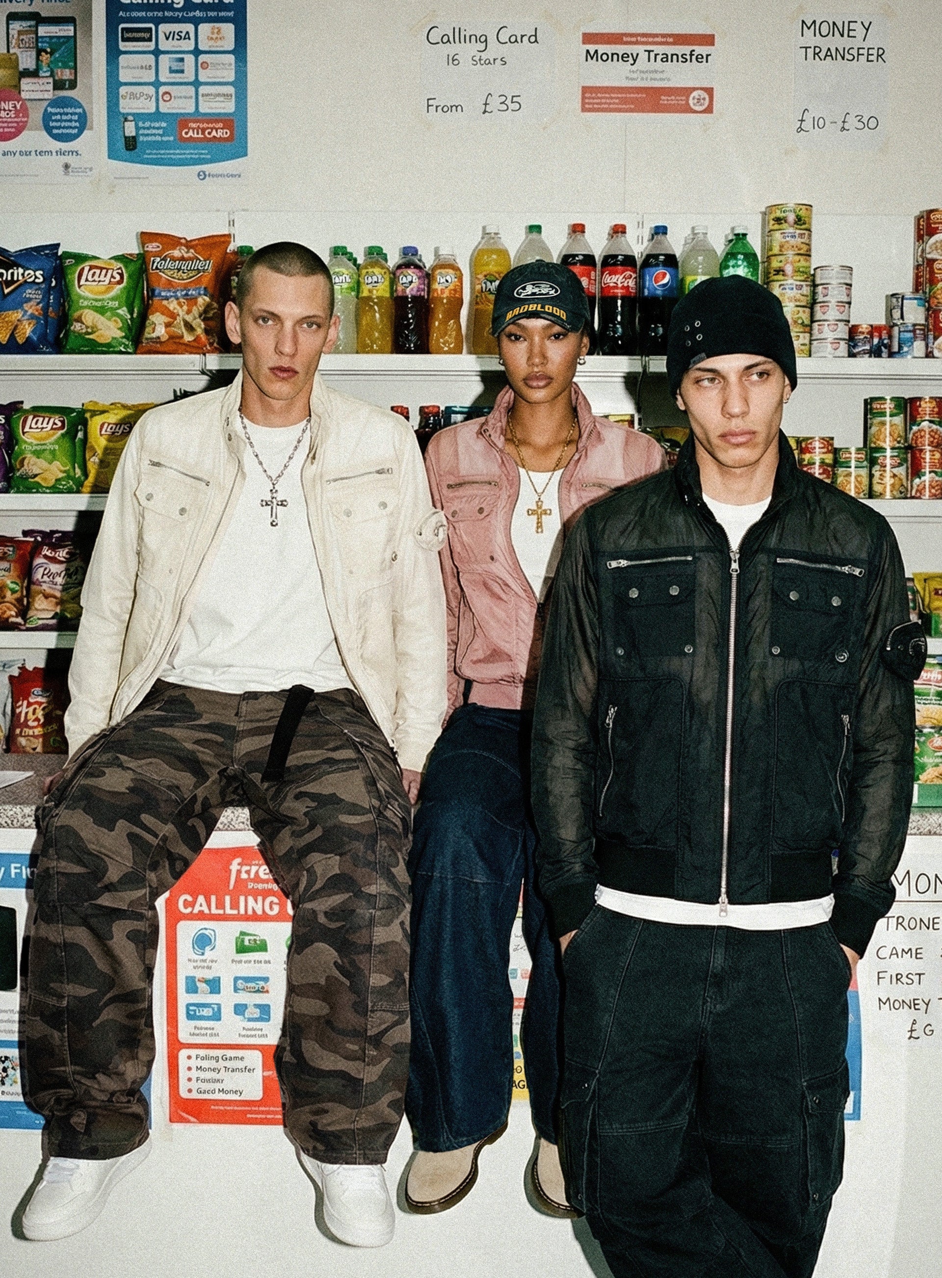 後側口袋飾有金屬孔眼(Eyelet)細節,並搭配前後拼接剪裁設計。