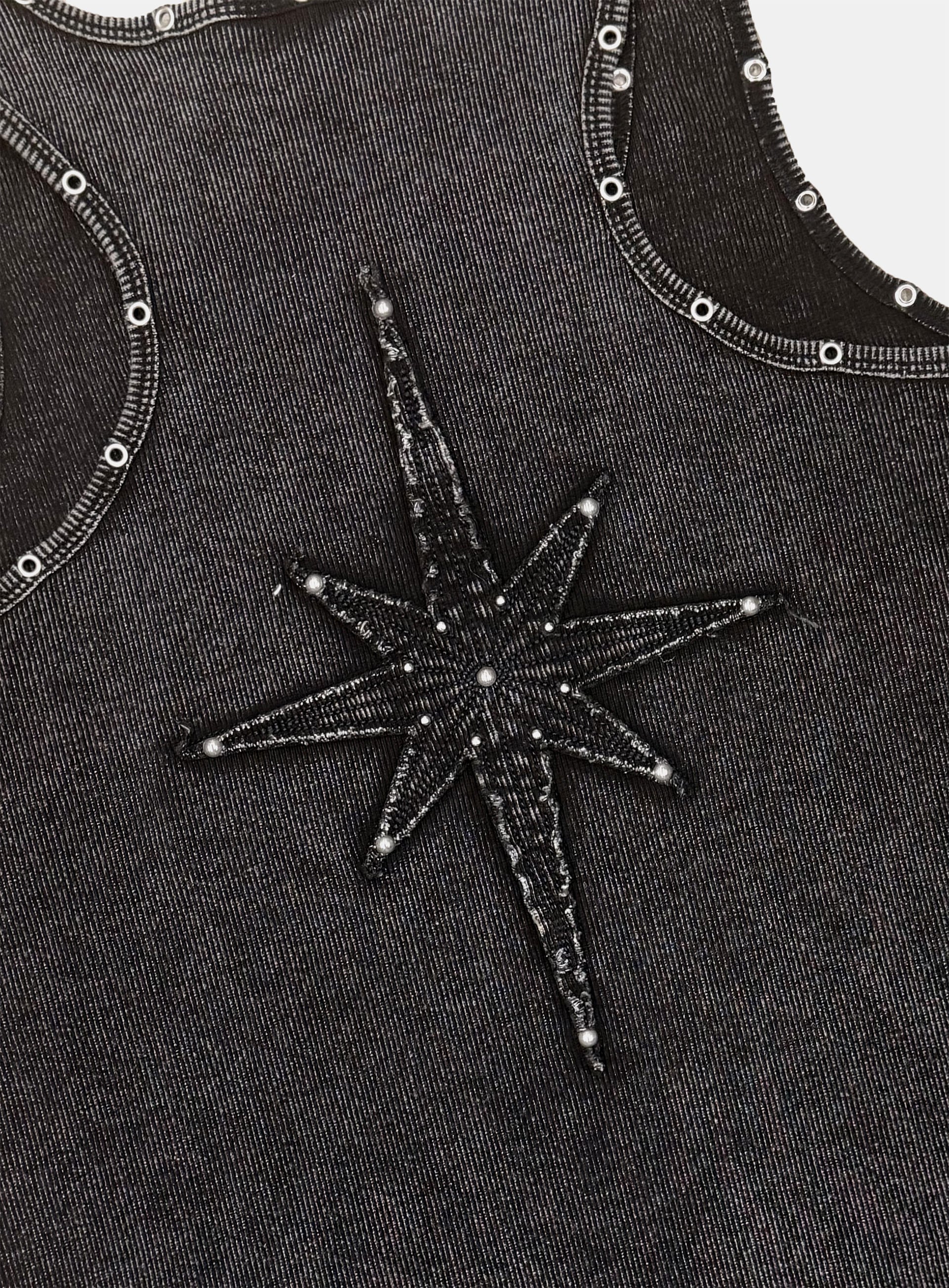 搭配領口金屬孔眼細節作為亮點的 Viper Cotton Rib Asymmetric Top。