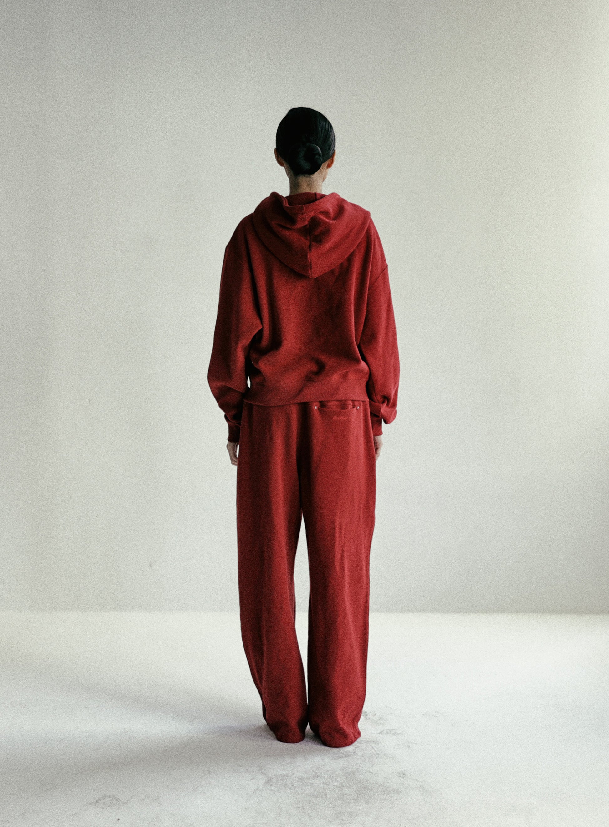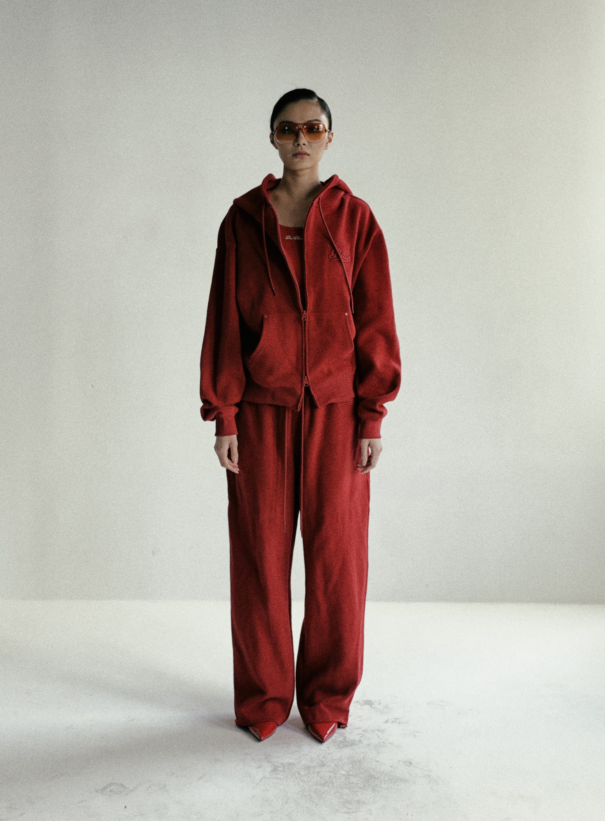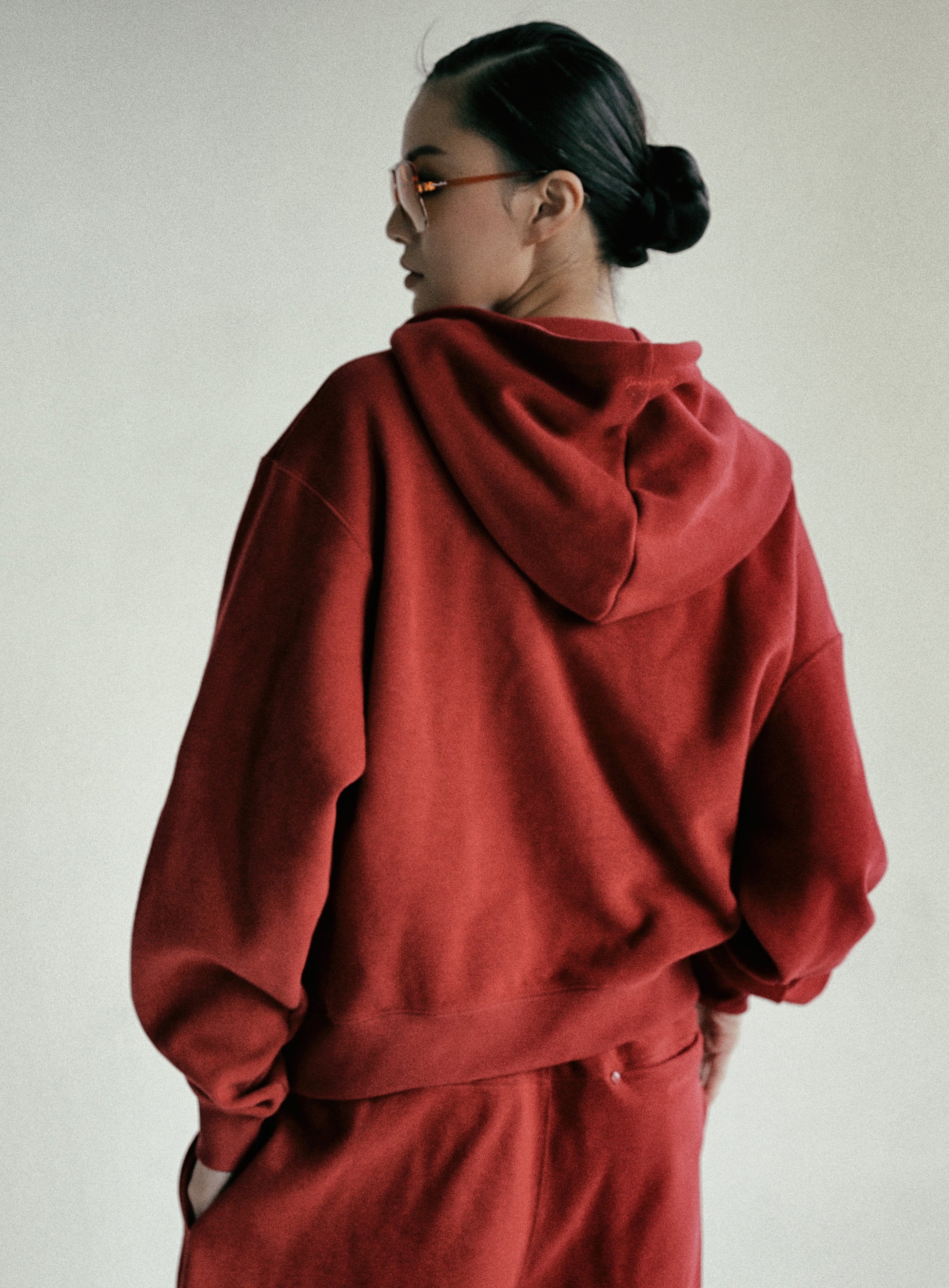 柔軟連帽夾克,採用自織柔軟有機棉毛圈布材質製成。