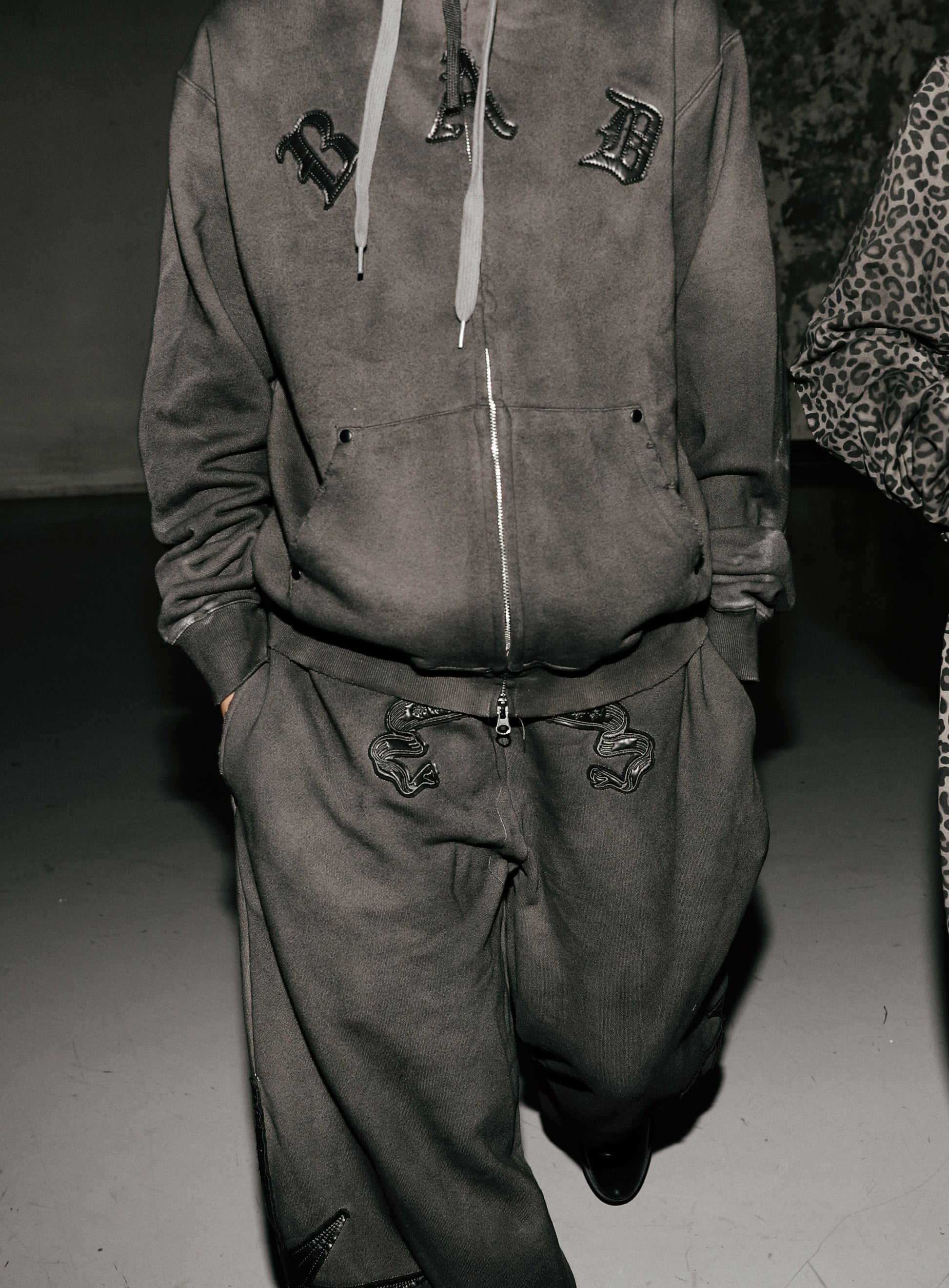 採用Dirty Aging工藝處理,展現復古洗水效果,並以皮革貼片細節打造出迷人的Cosmo Patch 2 Way Curved Jogger Trousers。