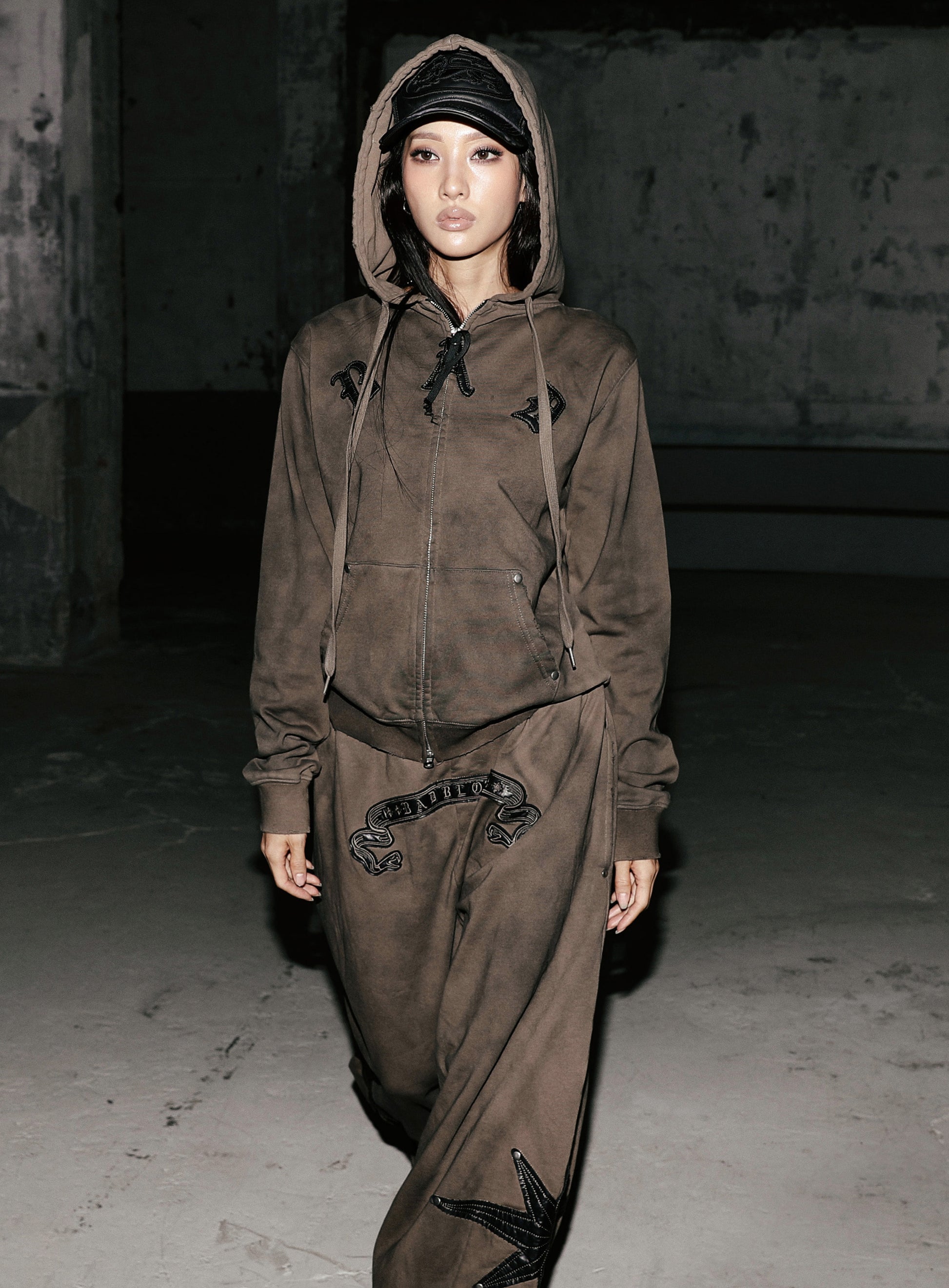 採用Dirty Aging工藝處理,展現復古洗水效果,並以皮革貼片細節打造出迷人的Cosmo Patch 2 Way Curved Jogger Trousers。