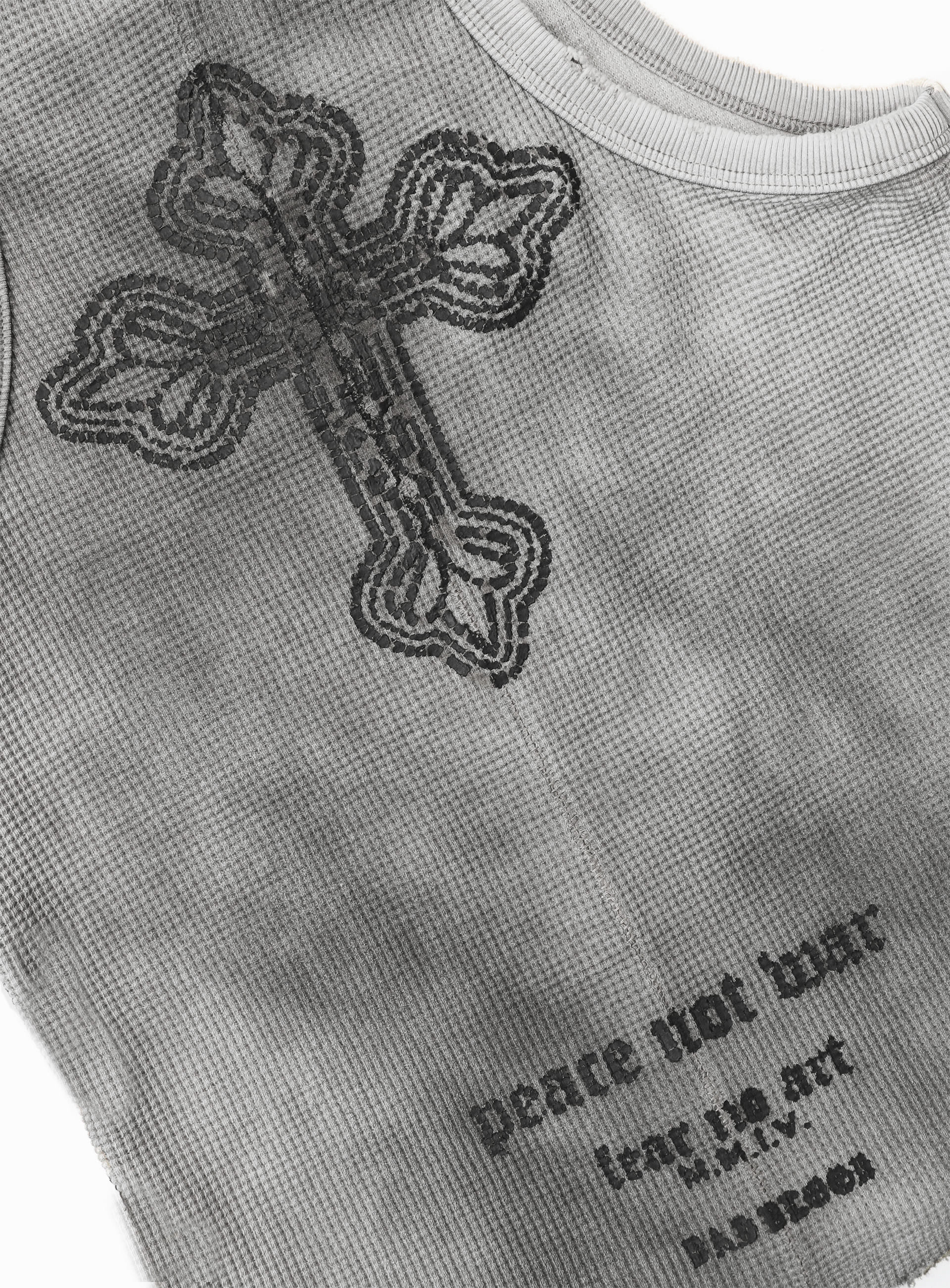 領口、袖口與下擺皆帶有仿舊破壞細節,並結合龜裂印刷工藝,呈現粗獷又充滿態度的設計感。