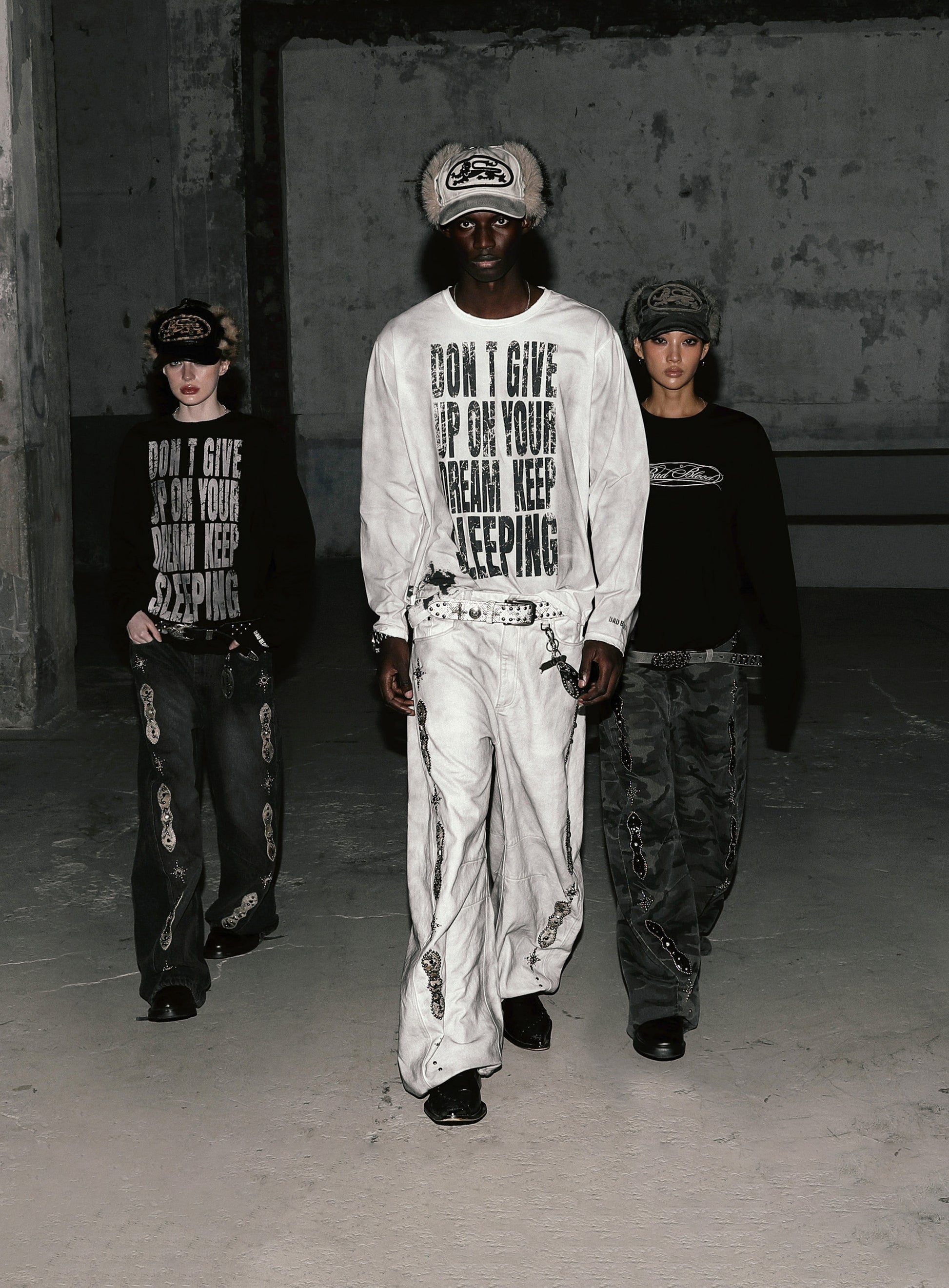 搭配 Badblood 傳達訊息的印花圖案,KEEP SLEEPING 長袖上衣。
