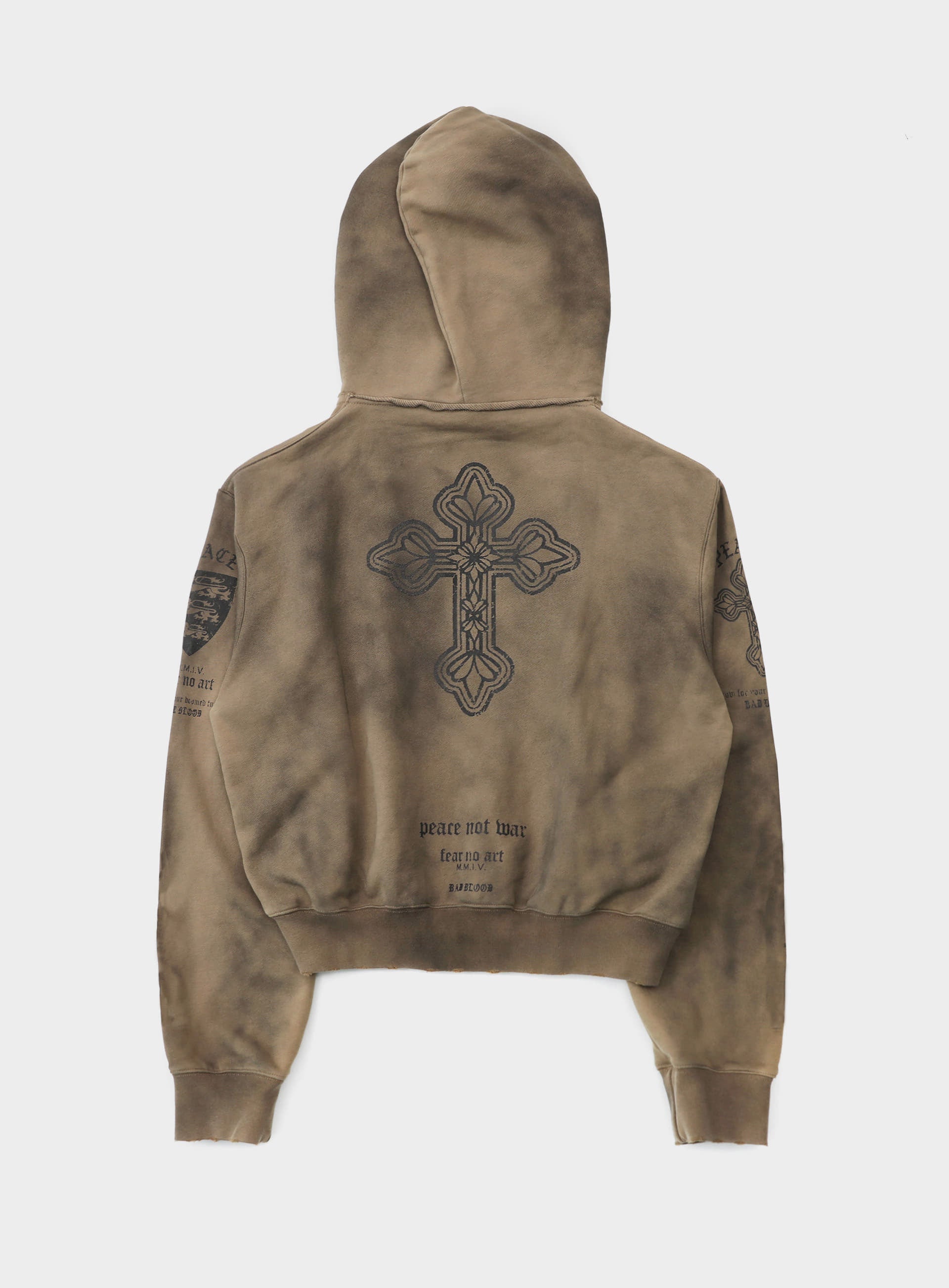 以反戰訊息為主題,融合 BADBLOOD 獨有的圖像設計,展現品牌哲學與個性,打造出獨具特色的 PEACE NOT WAR 連帽拉鍊外套。