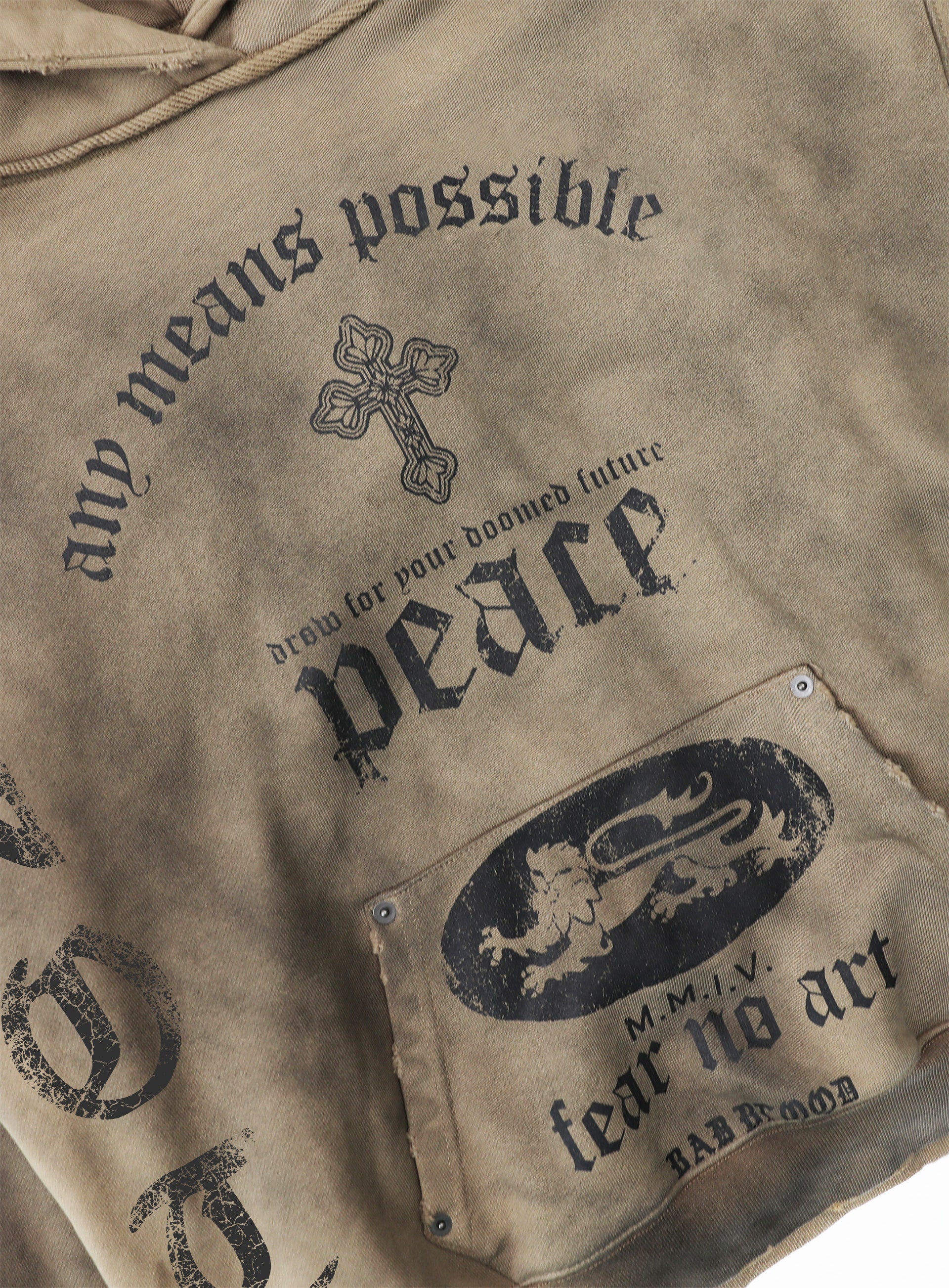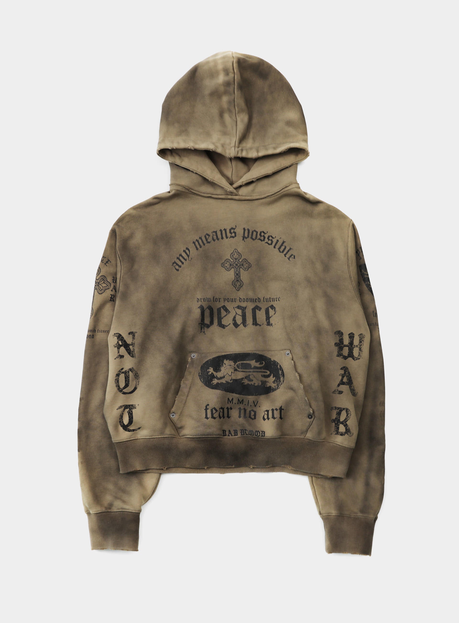採用厚磅法式毛圈布料製作,並搭配仿舊龜裂印刷細節。帽子、袖口與下擺帶有做舊破壞設計,前方袋鼠口袋以鉚釘點綴。