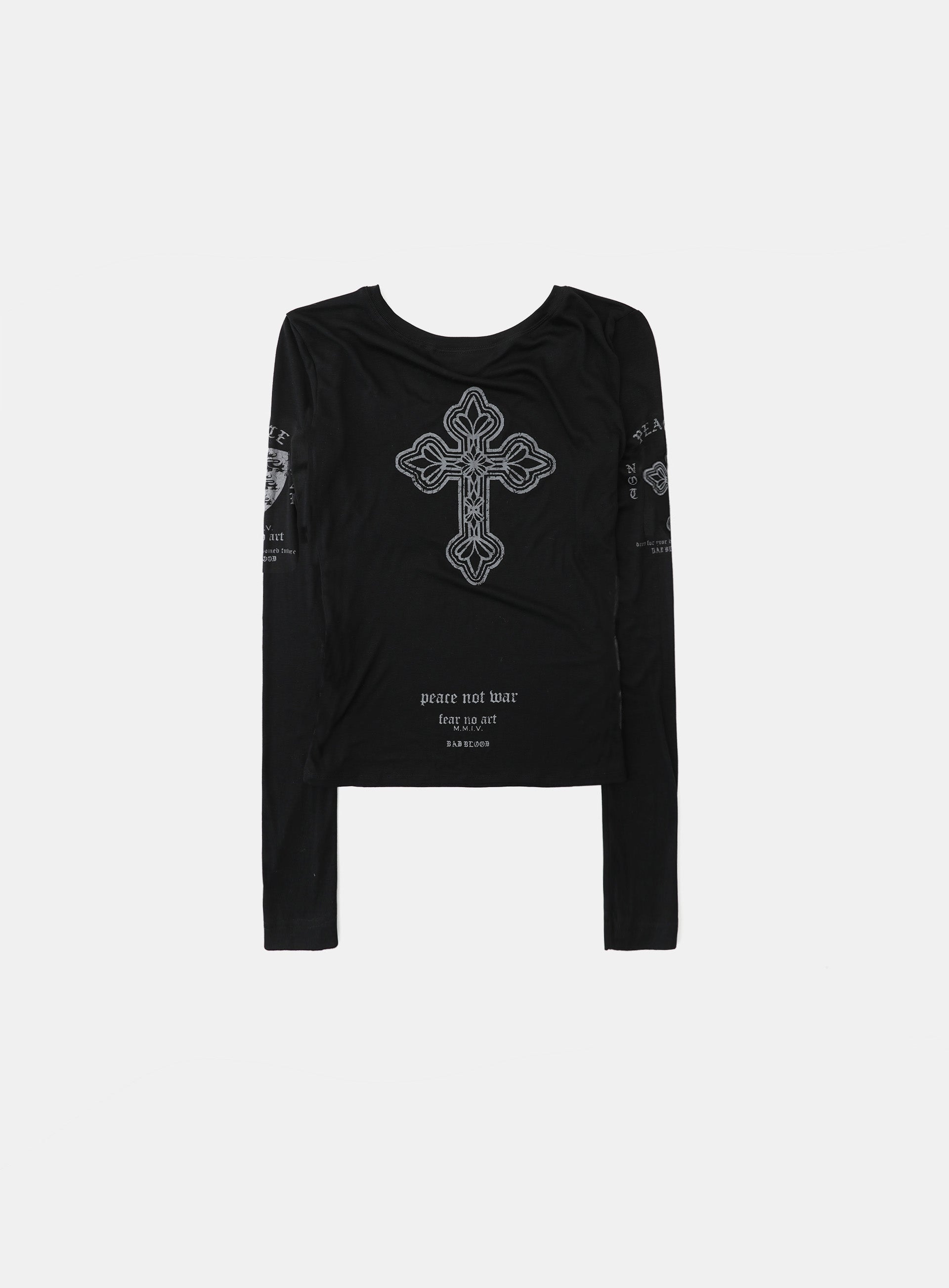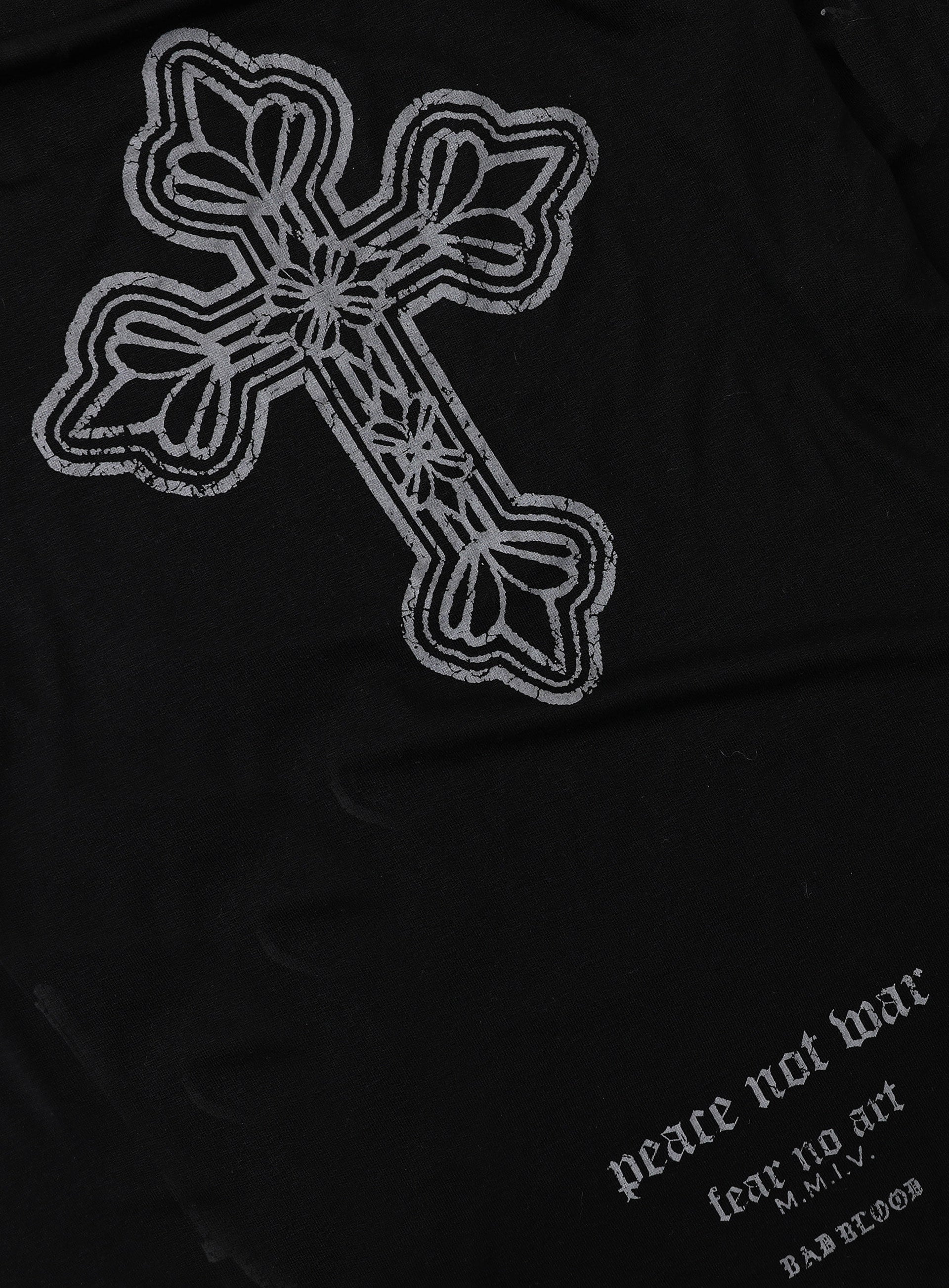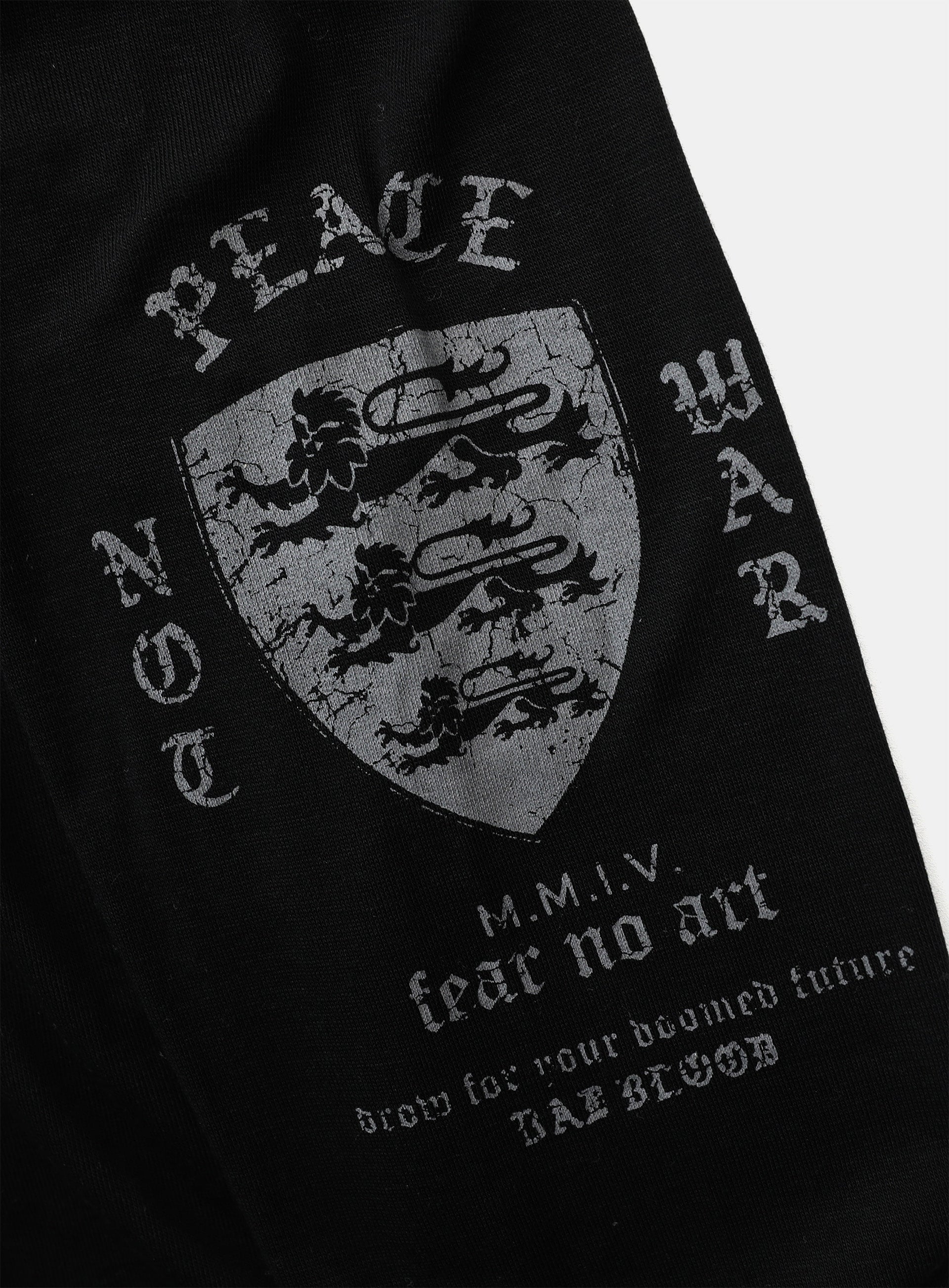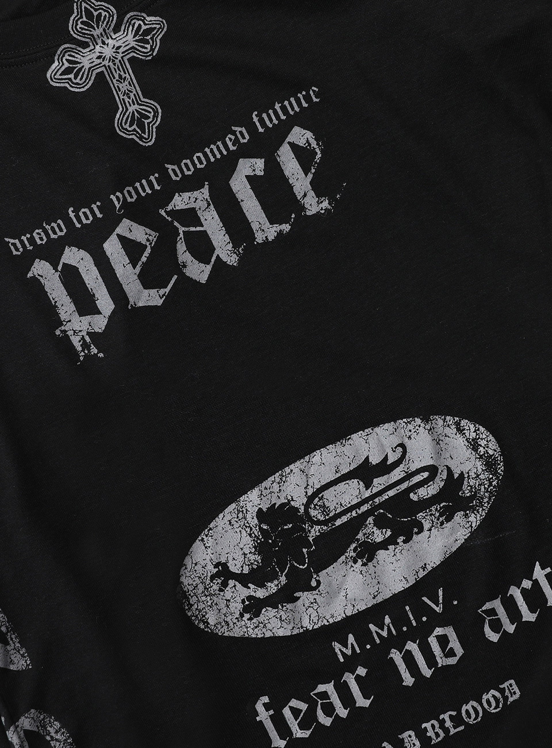 搭配仿舊龜裂印刷細節,袖口飾有哥德式十字圖案,胸前為黑體字樣與獅子盾徽印花,背面則印有大型哥德式十字圖案,呈現強烈的視覺風格。