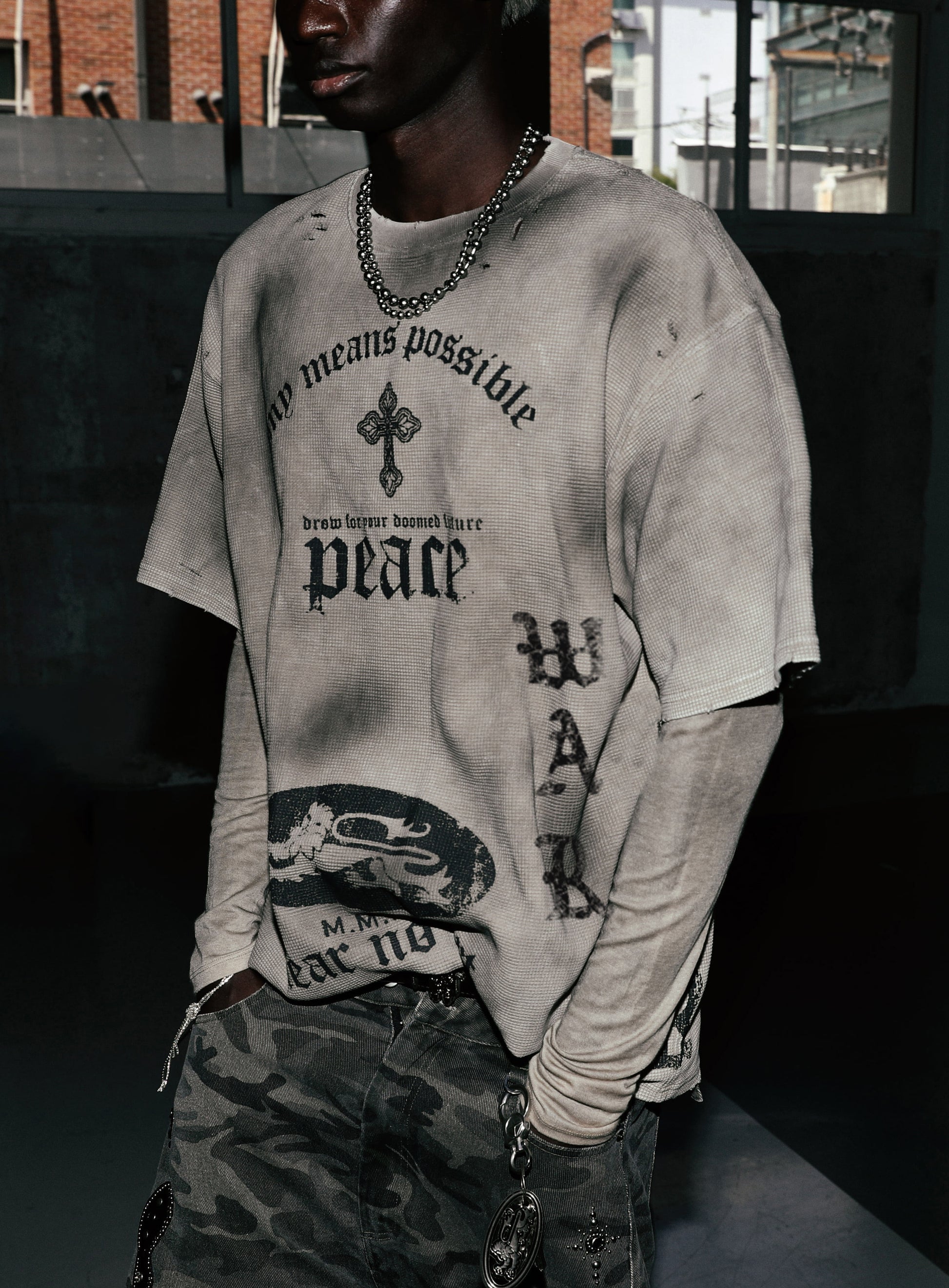 細節處理上加入仿舊龜裂印刷,以及袖口、下擺與領口的破壞風格設計,展現強烈的街頭氛圍。