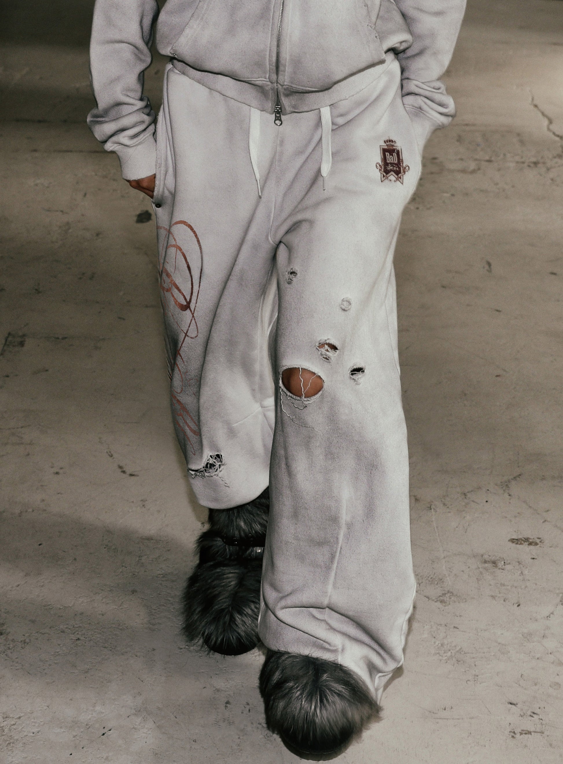 使用Dirty Aging工藝處理,展現復古洗水效果,並以破裂印刷標誌突顯的Royal Classic Distressed 2 Way Curved Jogger Trousers。