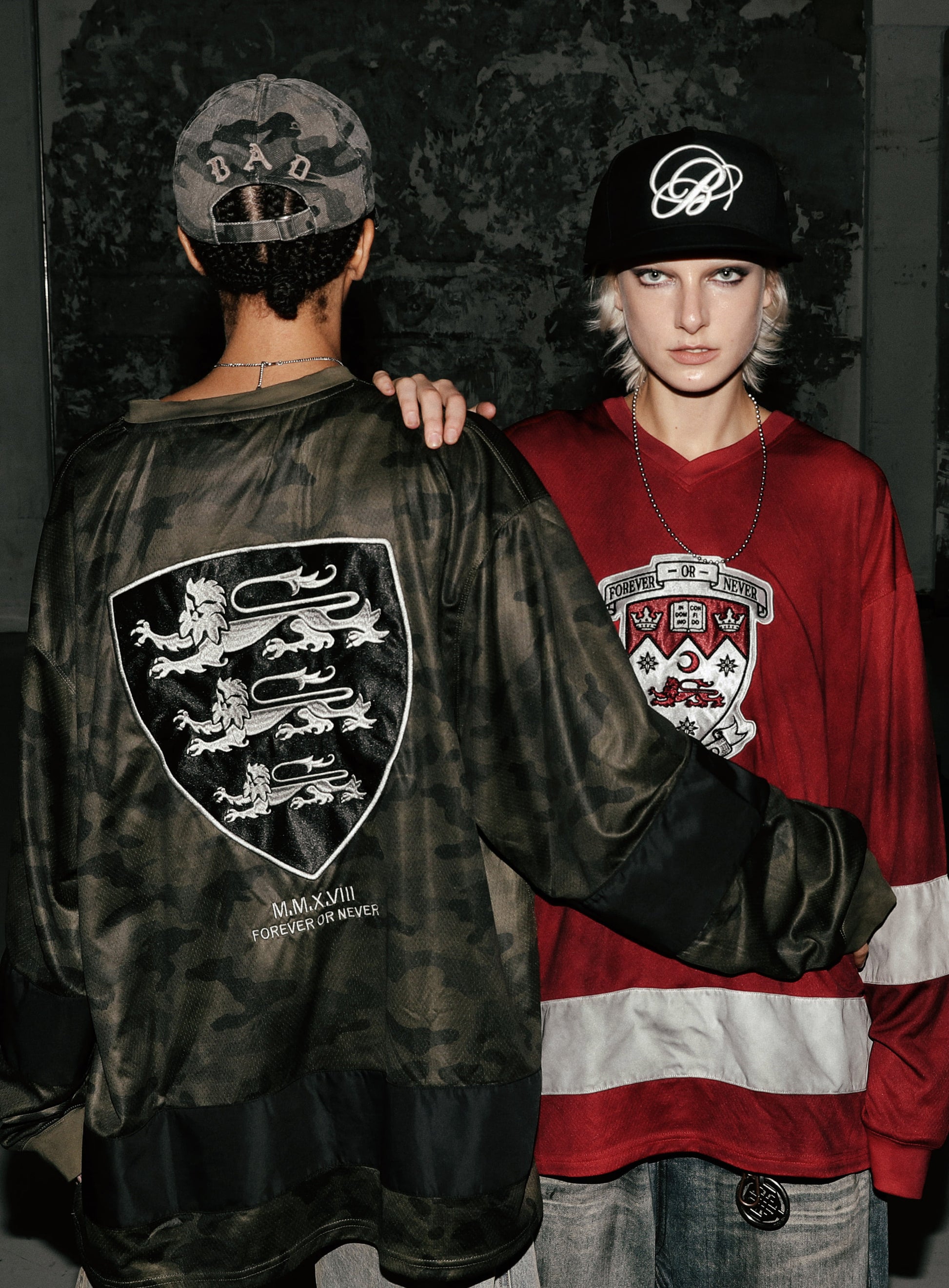 並以街頭風格的獅子 Logo 為亮點的 Shield-M 對比配色 V 領長袖運動上衣。