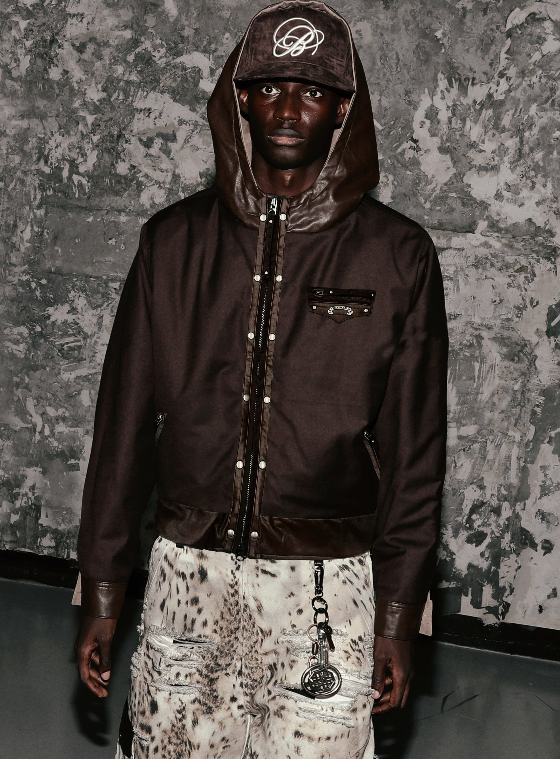 採用高級織物與皮革混合製成,帶來優雅質感,兼具堅韌紮實的觸感與挺括輪廓——Viper 91 拼色連帽飛行外套。