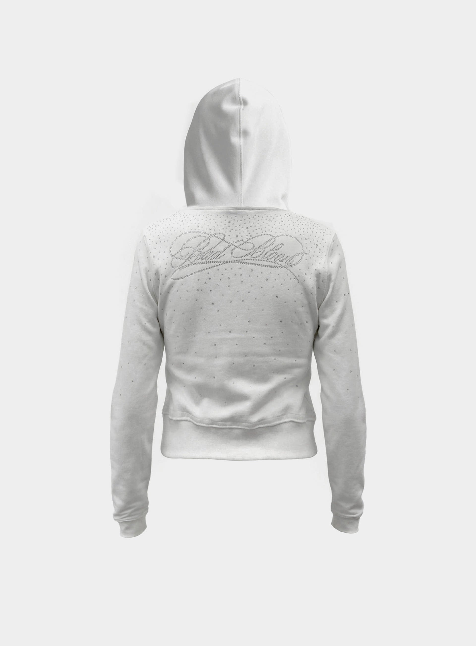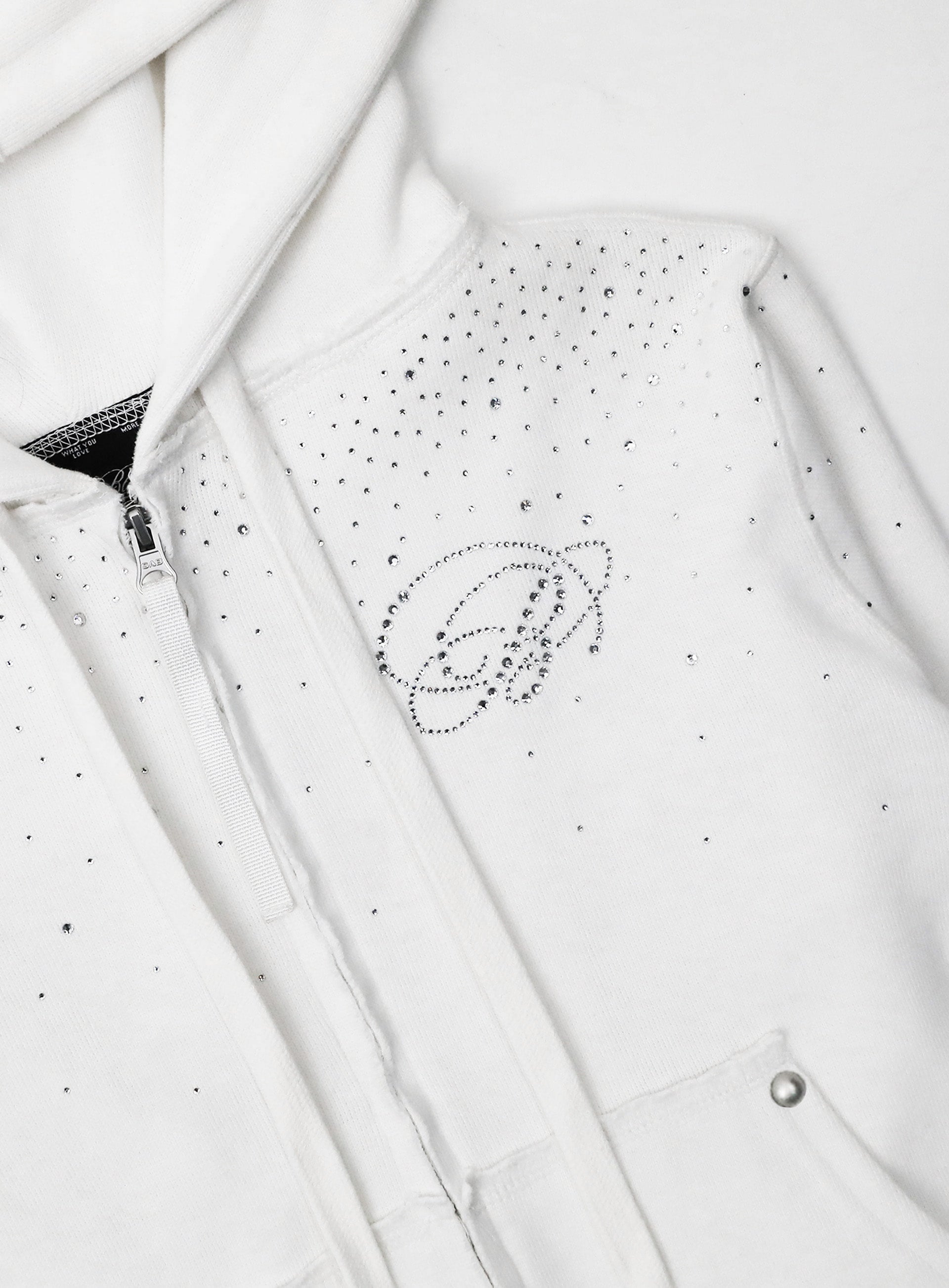 [w-hde25-077] Dark Classic Rhinestone Hooded Zip-Up Slim Fit - White