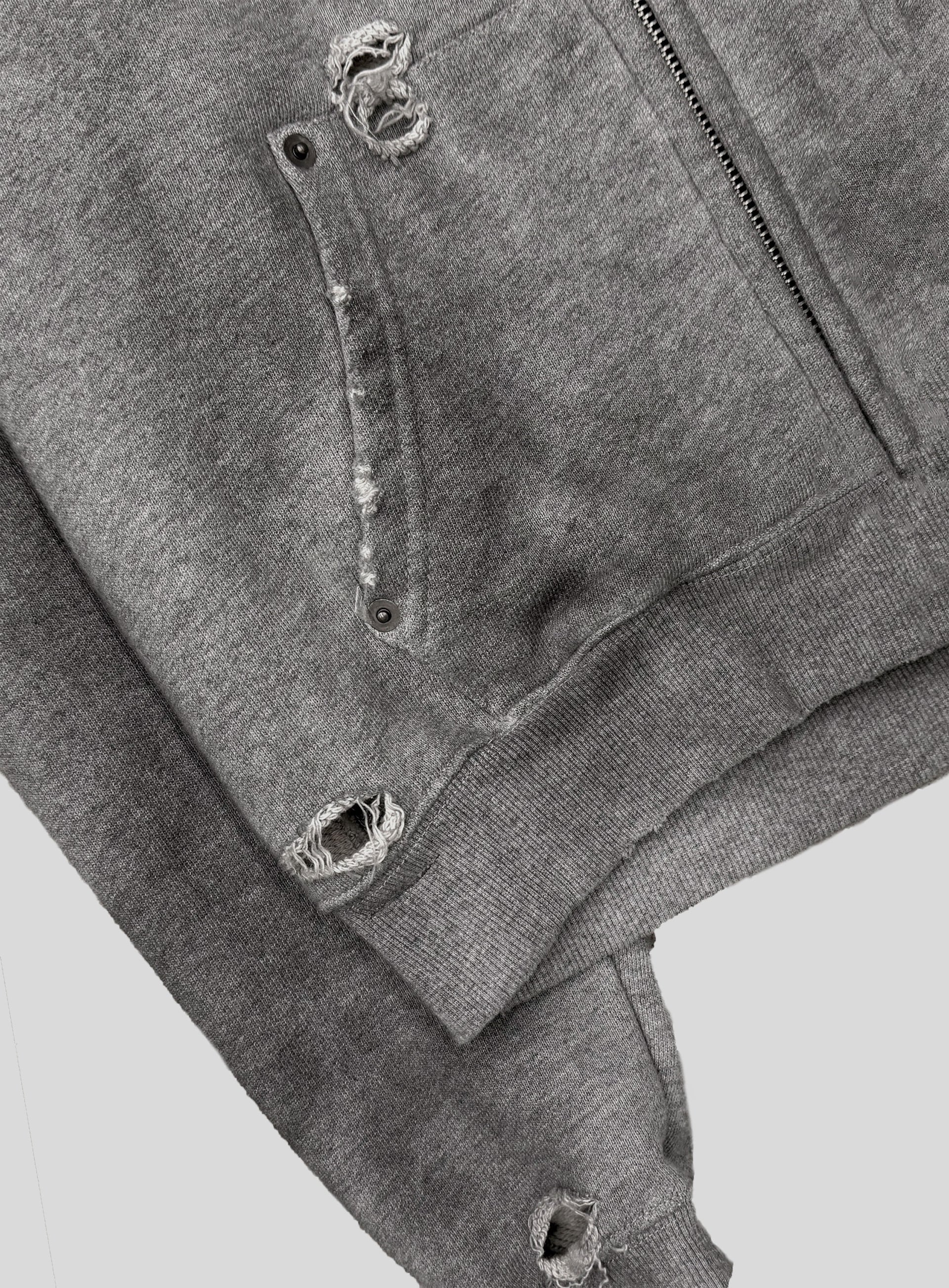 呈現穿著與時間痕跡感的粗獷質感的 Shield Old Glory 連帽拉鍊外套。