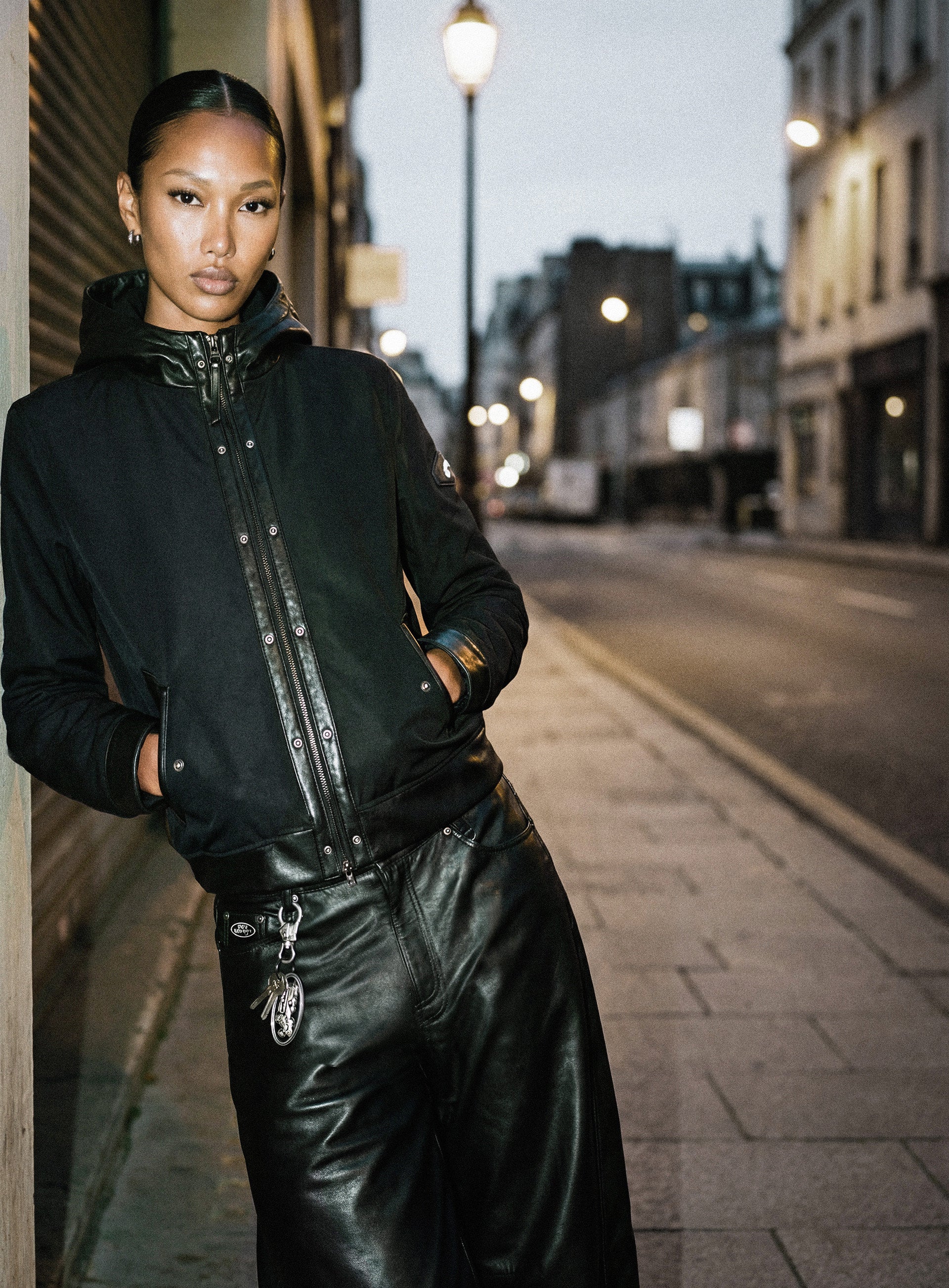 帽子外側加入皮革袖口式細節設計,提升整體質感。