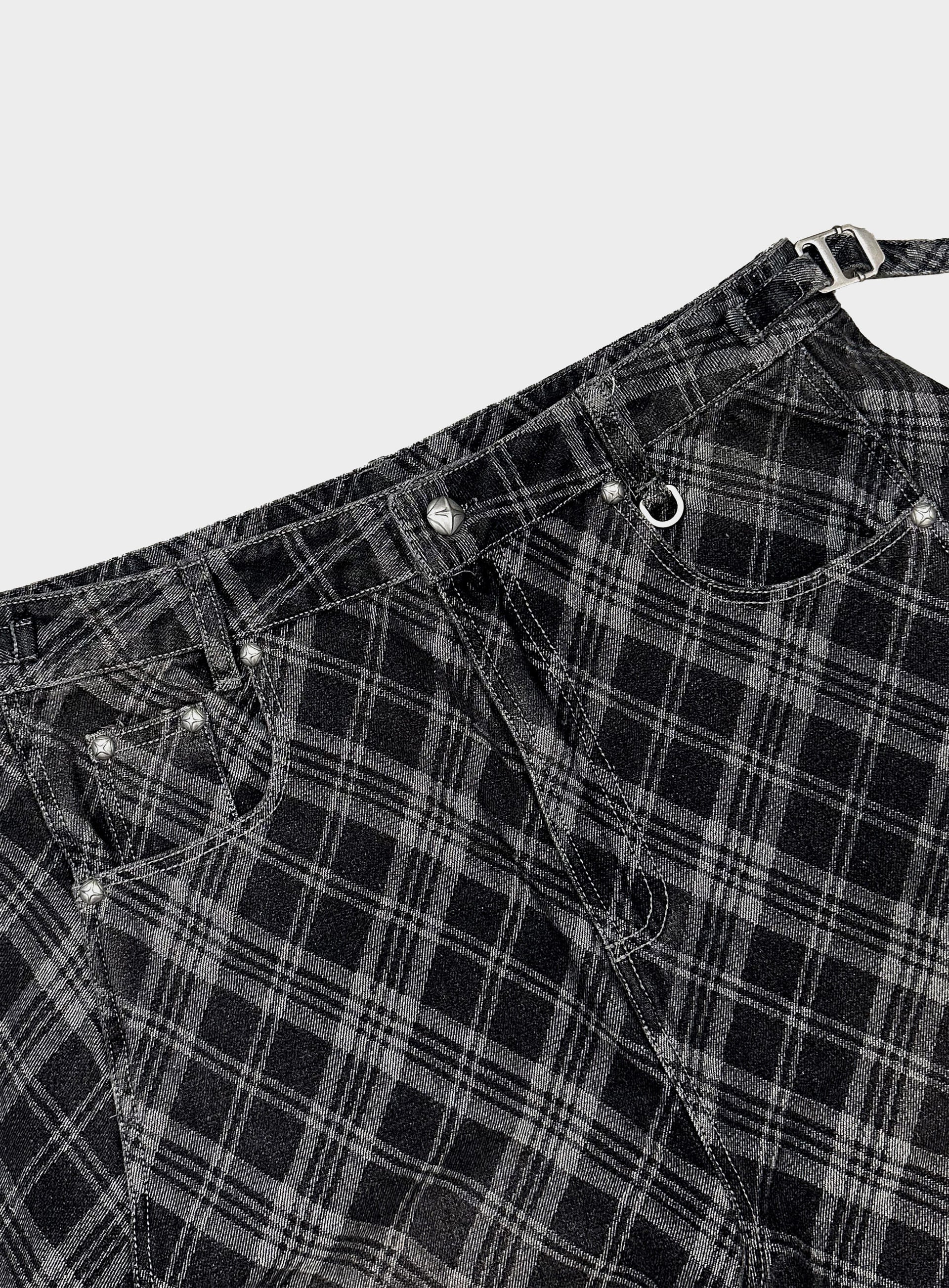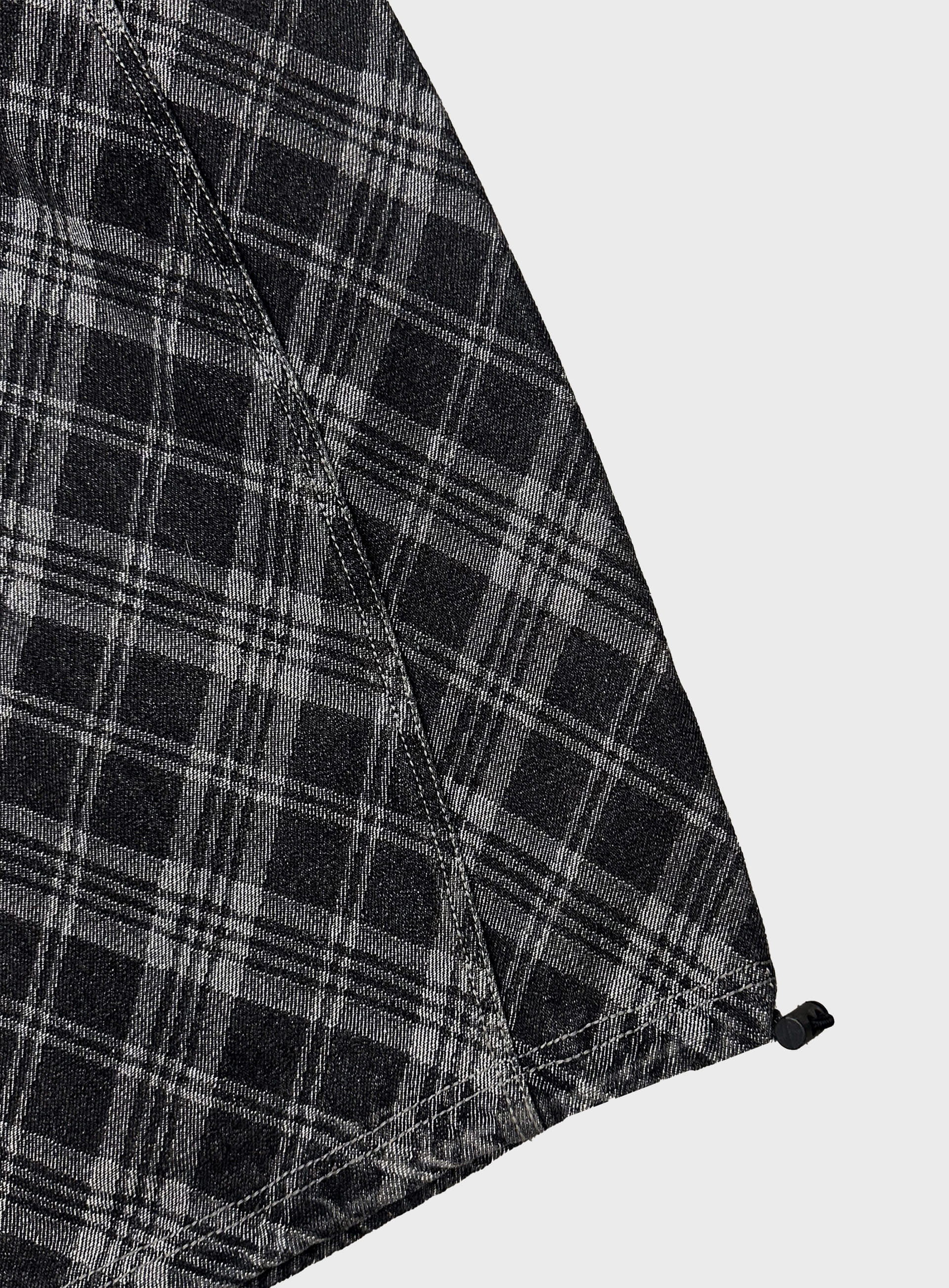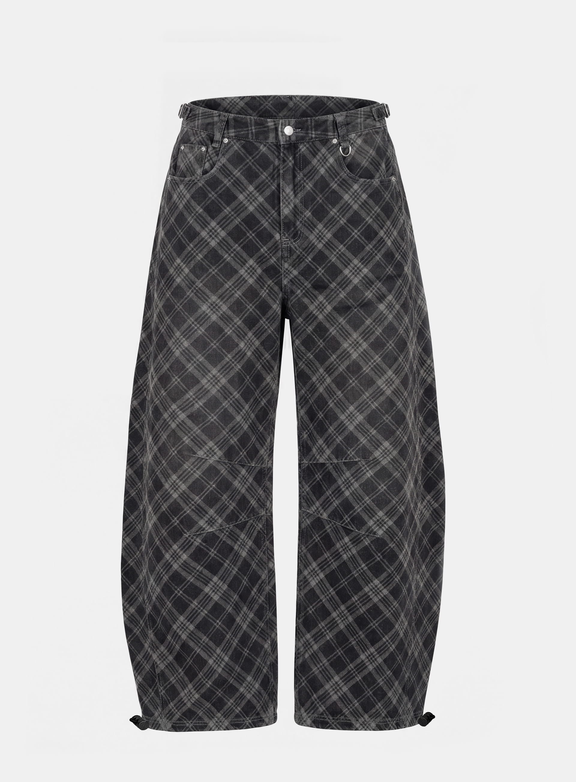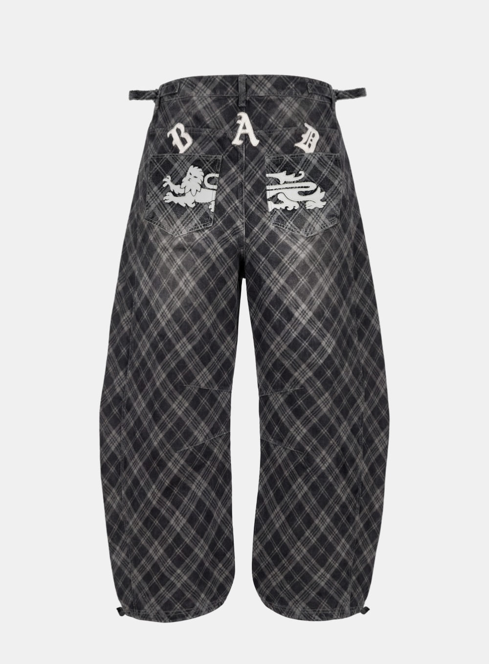 [w-pts25-124] Lion Patch Washed Barrel Pants - Black Denim Check