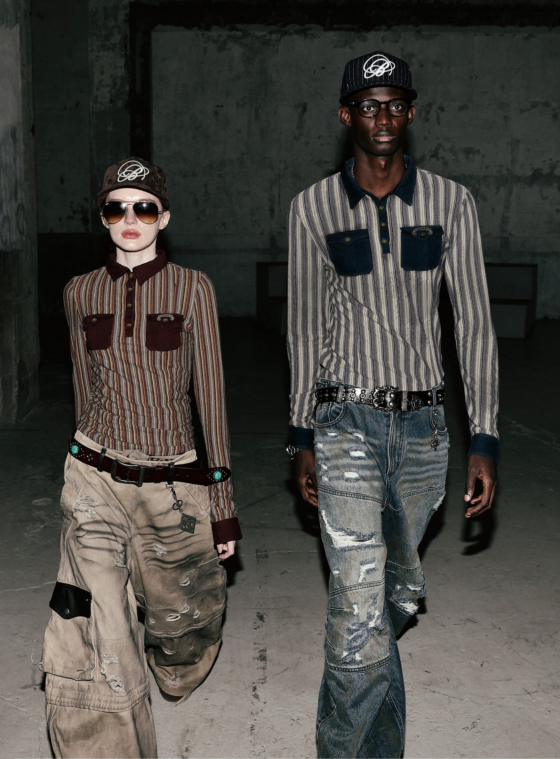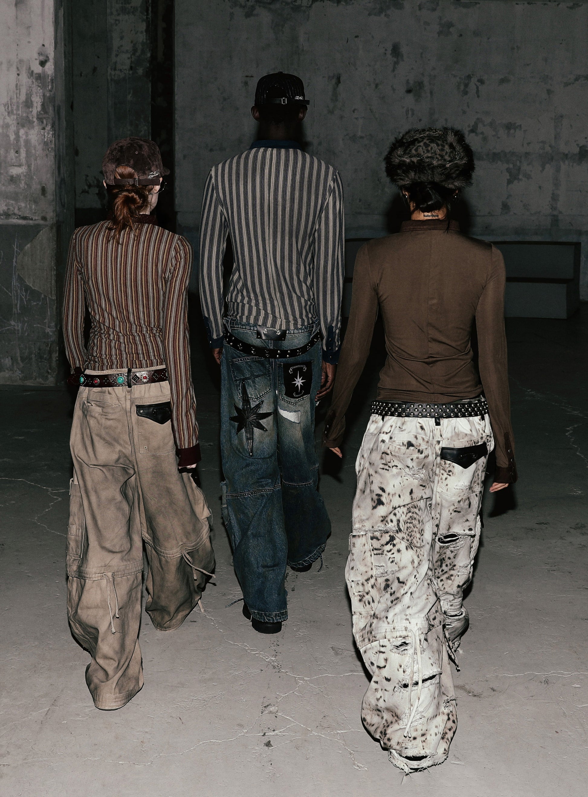 以工裝風格為基調,搭配配色布料點綴與髒感老化加工,
